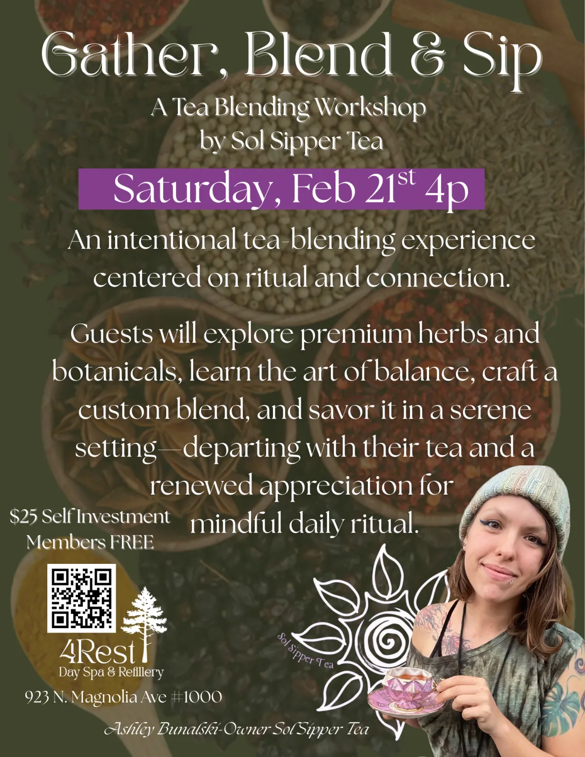 You'll create a custom tea blend aligned with your body, mood, or personal intention-whether that’s relaxation, grounding, digestion, or daily nourishment. You’ll leave with your own hand crafted tea to enjoy at home, along with the knowledge and confidence to continue blending mindfully.
